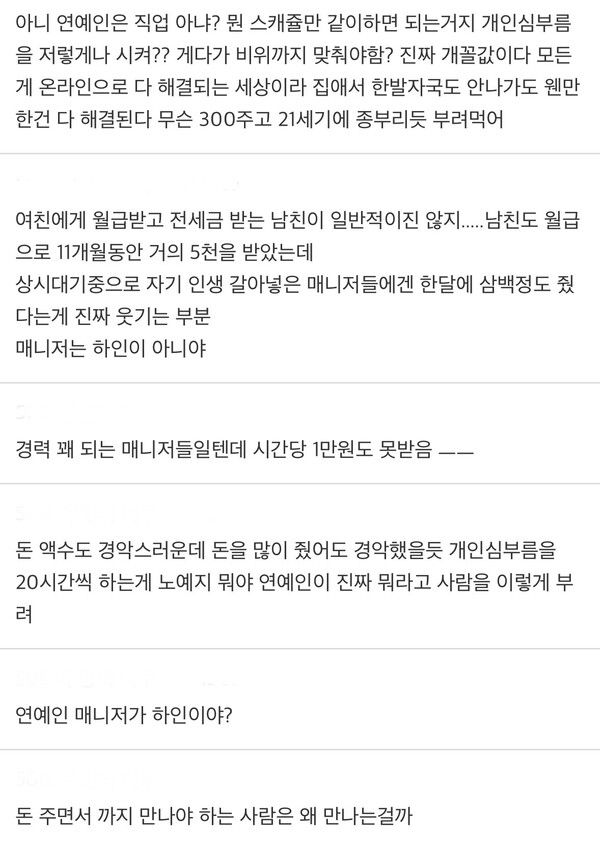 특히 매니저들의 노동 조건이 열악하다는 점, 사적 업무와 공적 업무의 경계가 흐려진다는 문제는 연예계 전반에 걸쳐 반복적으로 제기되어 왔던 사안으로, 이번 사건이 이를 다시 환기시키는 계기가 되고 있다.