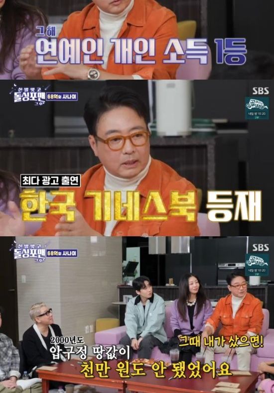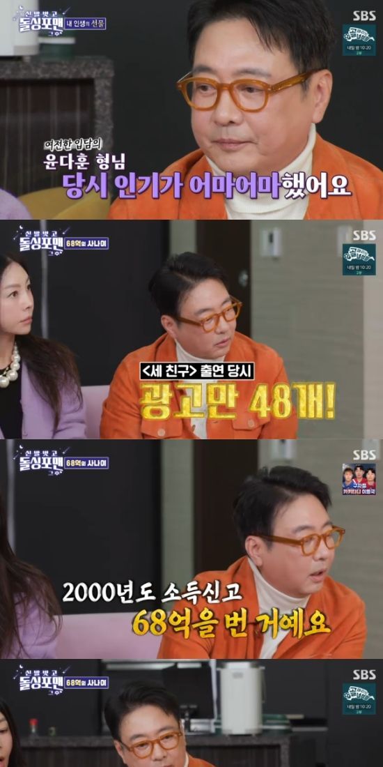 이에 윤다훈은 "당시 1년에 광고를 48개 찍었다. 2000년도에 소득 신고를 했는데 68억을 벌었더라. 연예인 개인 소득 1등이었다"면서 "그때 강남 땅을 샀었다면"이라고 장난치며 웃었다.