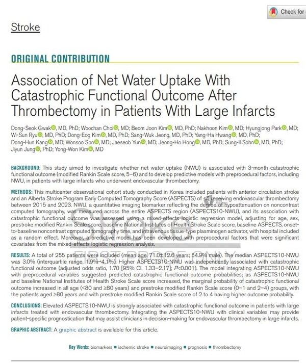 동국대 일산병원, 경북대병원, 계명대 동산병원, 분당서울대병원 연구진은 255명의 중증 뇌경색 환자를 분석한 결과, CT에서 측정된 NWU 수치가 높을수록 혈관 재개통 시술 이후 뇌부종·출혈 등 합병증 위험도 증가한다는 사실을 확인했다. 또 NWU를 분석에 포함할 경우 예후 예측 정확도가 큰 폭으로 향상된다는 점도 밝혀냈다.