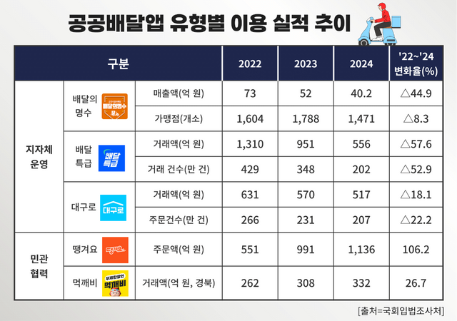 그러나 공공배달앱 간 격차는 커지고 있다. 경기도 '배달특급'의 거래액은 2022년 1310억원에서 2024년 556억원으로 57.6%나 줄었다. 군산시 '배달의명수'는 같은 기간 매출이 73억원에서 40억2000만원으로 44.9% 감소했다. 대구시 '대구로' 거래액 또한 18.1% 줄며 하향 곡선을 그렸다. 반면 민관협력형 공공앱인 '땡겨요' 주문액은 551억원에서 1136억원으로 2년 새 106.2% 급증했고 제주 '먹깨비'는 주문 건수와 가맹점 수가 1~2년 사이 세 자릿수 증가율을 보이며 성장세를 이어가고 있다.