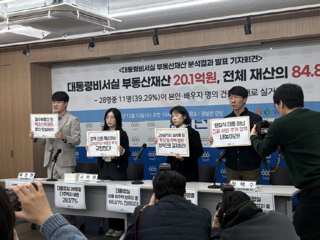 경제정의실천시민연합(경실련)은 10일 이같은 내용을 포함한 대통령비서실 부동산재산 분석결과를 발표했다. 이날 대통령비서실 고위공직자 28명의 부동산재산 분석 결과에 따르면 비서실 평균 신고재산은 국민 평균 재산(4억 1752만원)의 약 4.9배였다. 지난 4일 공개된 22대 국회의원 부동산 분석에 이은 두 번째 조사다.