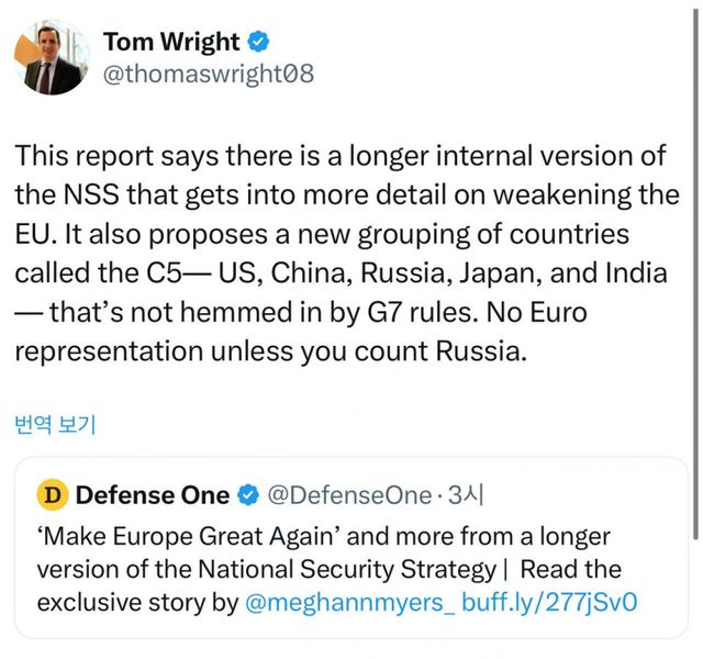 안보 전문 매체 '디펜스원'은 최근 공개된 미국 국가안보전략(NSS)의 초기 초안 내용을 보도했다. 보도에 따르면 최종 발표된 전략서보다 방대한 분량의 이 초안에는 기존 국제 질서의 변화를 예고하는 구상이 담겨 있었다.
