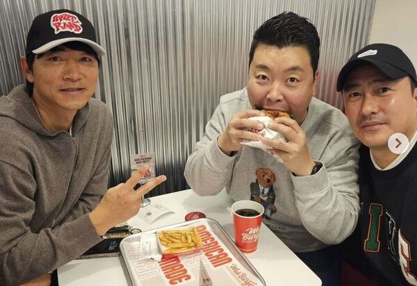 사진 속 김남일은 브이 포즈를 취하고 있고, 정호영은 햄버거를 한입 베어먹는 모습을 보였다.