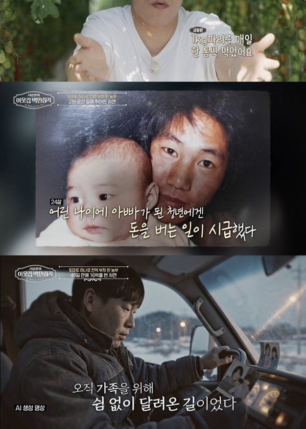 김호연의 인생은 반전과 굴곡 그 자체였다. 24살, 어린 나이에 아빠가 된 그는 가족을 먹여 살리기 위해 높은 급여를 좇아 위험천만한 광산으로 뛰어들었다. 이후 트럭 한 대로 밭떼기 장사를 시작해 전국을 누볐고, 전 재산 300만 원을 털어 농사에 도전했지만 실패는 반복됐다. 그는 그 시기를 떠올리며 “진짜 악에 받쳤다”고 고백한다. 그럼에도 포기하지 않고 쉼 없이 달렸던 이유는 단 하나, 오직 가족을 위해서였다. 그런 김호연이 ‘아들을 여러 번 쫓아냈다’는 숨겨진 스토리가 공개돼 충격을 안긴다. 이번 방송에서는 김호연의 아들이 직접 출연, 아버지에 대한 속마음을 솔직하게 드러낸다. 이들 부자에게 감춰진 사연은 12월 10일 수요일 밤 9시 55분 EBS ‘서장훈의 이웃집 백만장자’ 방송에서 확인할 수 있다.