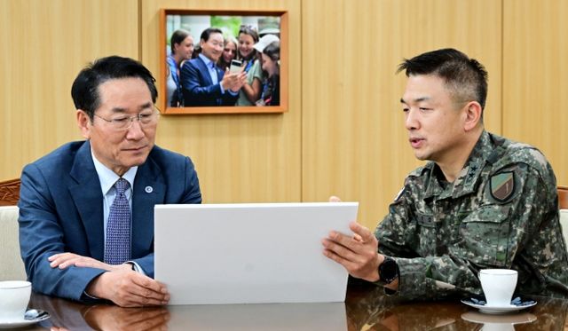 | ▲ 유정복 인천광역시장이 10일 시청 접견실에서 이광섭 육군 제17보병사단장과 인천 안보태세를 점검하고 있다. |