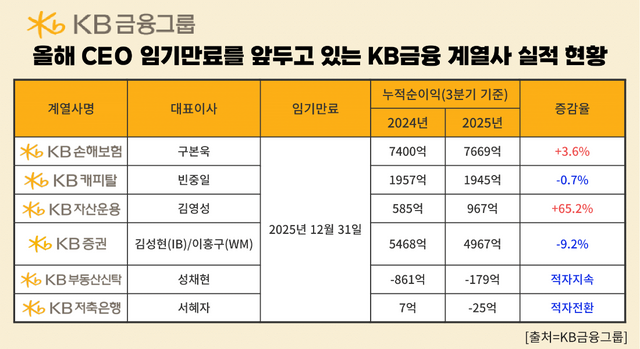 10일 금융권에 따르면 KB금융 전체 11개 계열사 가운데 올해 말 CEO 임기가 만료되는 계열사는 ▲KB증권 ▲KB손해보험 ▲KB자산운용 ▲KB캐피탈 ▲KB부동산신탁 ▲KB저축은행 등 6곳에 달한다. 이들 계열사 실적이 그룹 전체의 성과로 이어지는 만큼 이번 인사 역시 실적에 따라 좌우될 가능성이 높게 점쳐진다. 특히 내년이 양 회장의 임기 마지막 해인 점을 고려할 때 실적을 바탕으로 한 철저한 신상필벌 인사가 불가피할 것이라는 전망이 우세하다.