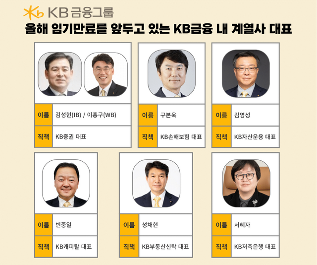 KB금융지주(이하 KB금융)가 역대급 규모의 CEO 인사를 앞두고 있다. 올해 말 11개 계열사 중 6곳의 최고경영자(CEO) 임기가 일제히 만료되면서 그룹 경영 구도에 상당한 변화가 예상된다. 몇몇 CEO는 탄탄한 실적을 바탕으로 유리한 고지를 점한 반면 경영 능력에 한계를 드러내며 연임에 경고등이 켜졌단 평가를 받는 CEO도 일부 존재한다. 금융권 안팎에선 이번 인사는 내년 임기가 만료되는 양종희 KB금융 회장의 연임 승부처로 봐도 무방하다는 평가가 나온다.