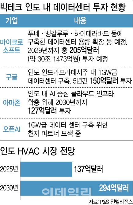 인도 내 AI 데이터센터가 확대로 HVAC 수요도 늘어날 것으로 전망된다. HVAC은 온도, 습도 등을 최적으로 유지하기 위해 사용되는 냉난방공조 기술 혹은 장비를 통칭하는 개념이다. AI 데이터센터가 막대한 전력을 사용하며 만들어내는 발열 문제를 해결하기 위한 초대형 냉방기 ‘칠러’ 등 제품이 주목을 받고 있다.