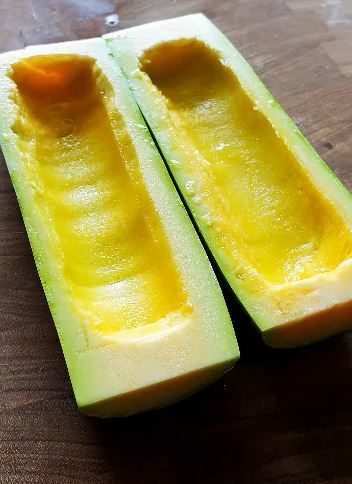 먼저 애호박을 반으로 자른다. 길게 반을 가른 뒤, 숟가락이나 전용 스푼을 이용해 가운데 속을 파낸다. 이때 너무 얇게 파내면 계란물이 흘러넘칠 수 있으니 적당한 두께를 유지하는 것이 중요하다. 속을 파낸 애호박은 찜기에 담기 좋도록 바닥이 평평하게 되도록 정리한다. 이렇게 준비된 애호박은 채워 넣을 계란물이 들어갈 ‘그릇’ 역할을 한다.