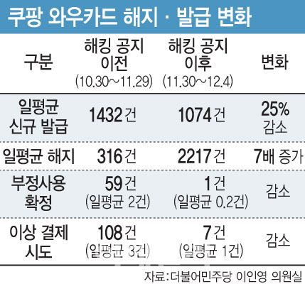 그러나 지난달 말 쿠팡이 3370만건의 개인정보 유출 사실을 공개한 이후 분위기는 급변했다. 해킹 공지 이전 한 달간(10월 30일~11월 29일) 와우카드 신규 발급은 일평균 1432건이었으나, 공지 이후(11월 30일~12월 4일)에는 1074건으로 약 25% 감소했다. 반면 같은 기간 해지 건수는 일평균 316건에서 2217건으로 치솟았다. 불과 닷새 동안 하루 2000건이 넘는 해지가 발생한 셈으로, 발급보다 해지의 증가폭이 월등히 커 ‘순이탈’ 흐름이 뚜렷해졌다. 업계 관계자는 “결제정보 유출 가능성에, 카드 해지 후 새로 발급받는 이용자도 있지만, 해지 한 뒤 재발급을 안하는 사례가 더 많은 상황”이라고 전했다.