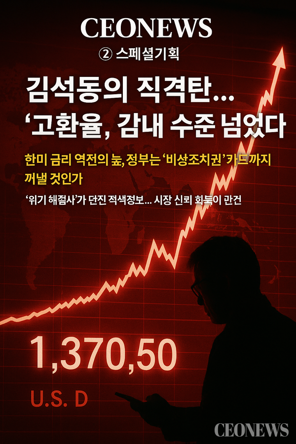 [CEONEWS=이재훈 대표기자] "현재 고환율 상황은 감내할 수 있는 수준을 넘어섰다." 김석동 전 금융위원장의 이 한마디는 평범한 경제 전망이 아니다. IMF 외환위기부터 카드 사태, 저축은행 사태까지 한국 경제의 결정적 위기 순간마다 칼자루를 쥐었던 정통 관료의 입에서 나온 적색경보다. 특히 그가 외환거래를 강제로 제한할 수 있는 '비상조치권(Safeguard)' 발동 가능성까지 언급하면서 재계와 관가에 적지 않은 충격파가 일고 있다. 원·달러 환율은 1,400원대를 넘나들며 고공행진 중이다. 정부는 구두 개입과 미시적 수급 조절에 나섰지만 시장은 요지부동이다. 김 전 위원장이 지목한 고환율의 근본 원인은 명확하다. 수년째 이어지고 있는 '한미 금리 역전' 현상과 이로 인한 자본 유출의 악순환이다. CEONEWS는 스페셜기획 2편에서 김 전 위원장의 경고를 기점으로 한미 금리 역전의 구조적 원인을 심층 진단하고, 정부의 대응 시나리오를 전망한다.