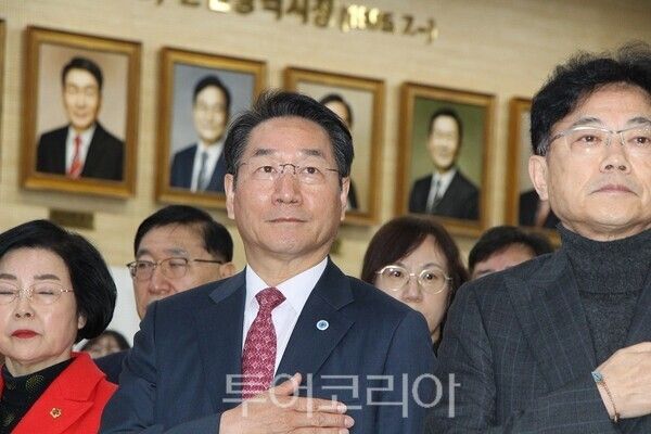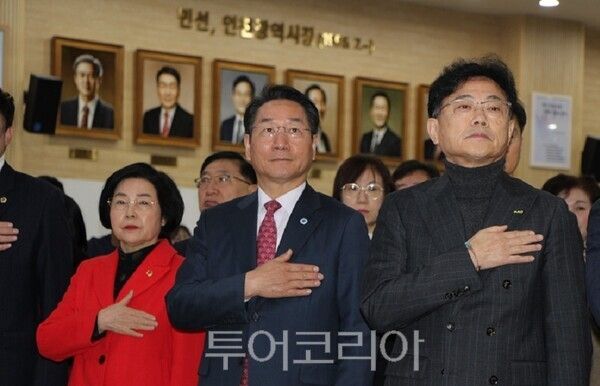 [투어코리아=이창호 기자] 유정복 인천시장이 11일 오전 시청 대회의실에서 개최된 '외로움 대응단 발대식' 행사에서 국민의례를 하고 있다. 2025.12.11. / 투어코리아 이창호 기자