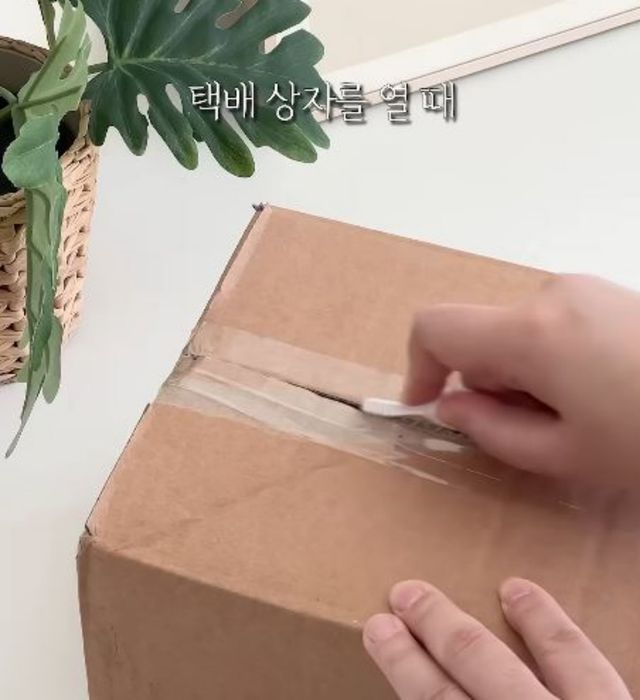 테이프에 붙여뒀던 배달 커터칼로 테이프르 자르는 모습. / 유튜브 '봄집사'