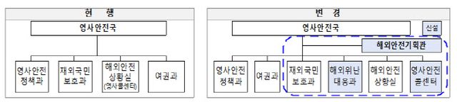 11일 행정안전부에 따르면 외교부 본부에 ‘해외안전기획관(국장급)’을 신설하고, 기존 ‘재외국민보호과’에 더해 ‘해외위난대응과’를 신설하여 재외국민 보호 정책 및 사건사고 예방·대응 기능을 종합적이고 체계적으로 강화해 나갈 계획이다.