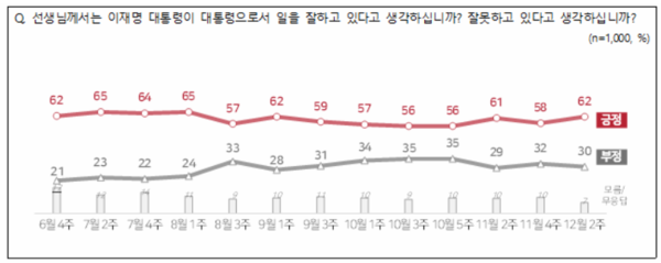 주요 정책에 대한 평가를 질문한 결과 외교(65%)와 복지(62%) 분야 긍정평가는 60%를 상회했고, 대북정책(52%)과 경제정책(51%)은 과반 이상이 긍정적으로 봤다. 반면, 부동산 정책은 긍정 40% 부정 47%였다.