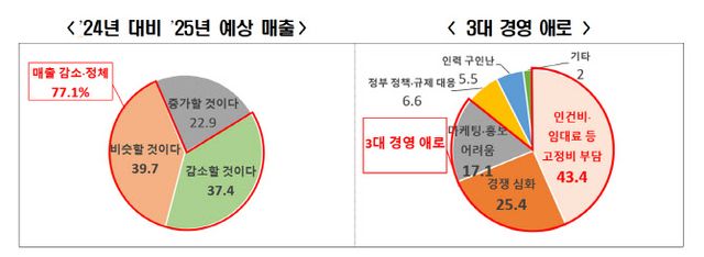 한경협이 타운홀 서밋 준비 과정에서 시장조사 전문기관인 모노리서치에 의뢰해 조사한 ‘소상공인 실태조사’ 결과(1000명 응답)를 보면 최근 소상공인의 경영환경이 전반적으로 악화한 것으로 나타났다. 소상공인 10명 중 8명(77.1%)이 2024년 대비 2025년 예상 매출이 ‘비슷하거나 감소할 것’이라고 답했다. 경영성과에 대해서도 ‘악화됐다’라는 응답이 46.5%였으며, 그 배경은 원자재·임대료 부담 증가, 세금 부담 등이 꼽혔다.