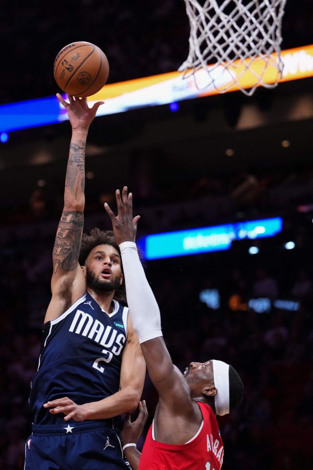 MIAMI, FLORIDA - NOVEMBER 24: Dereck Lively II #2 of the Dallas Mavericks goes up for a shot against Bam Adebayo #13 of the Miami Heat during the first quarter at Kaseya Center on November 24, 2024 in Miami, Florida. NOTE TO USER: User expressly acknowledges and agrees that, by downloading and or using this photograph, User is consenting to the terms and conditions of the Getty Images License Agreement. Rich Storry/Getty Images/AFP (Photo by Rich Storry / GETTY IMAGES NORTH AMERICA / Getty Images via AFP)/2024-11-25 09:26:19/