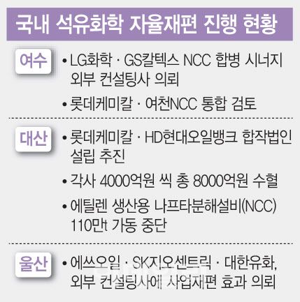 11일 업계에 따르면 현재 사업재편 속도가 좀체 나지 않는 여수와 울산에서도 각 기업이 막판 조율을 위해 릴레이 협상을 벌이고 있다. 국내 석화산단 중 가장 규모가 큰 여수에서는 LG화학과 GS칼텍스가 나프타분해설비(NCC)를 통합하는 방안에 대해 현재 외부 컨설팅업체에 시너지 효과를 의뢰한 상태다. 아직 구체적인 컨설팅 결과는 나오지 않았지만, 양사는 컨설팅사와 함께 자구안을 도출하기 위해 협상을 이어가는 것으로 전해진다.
