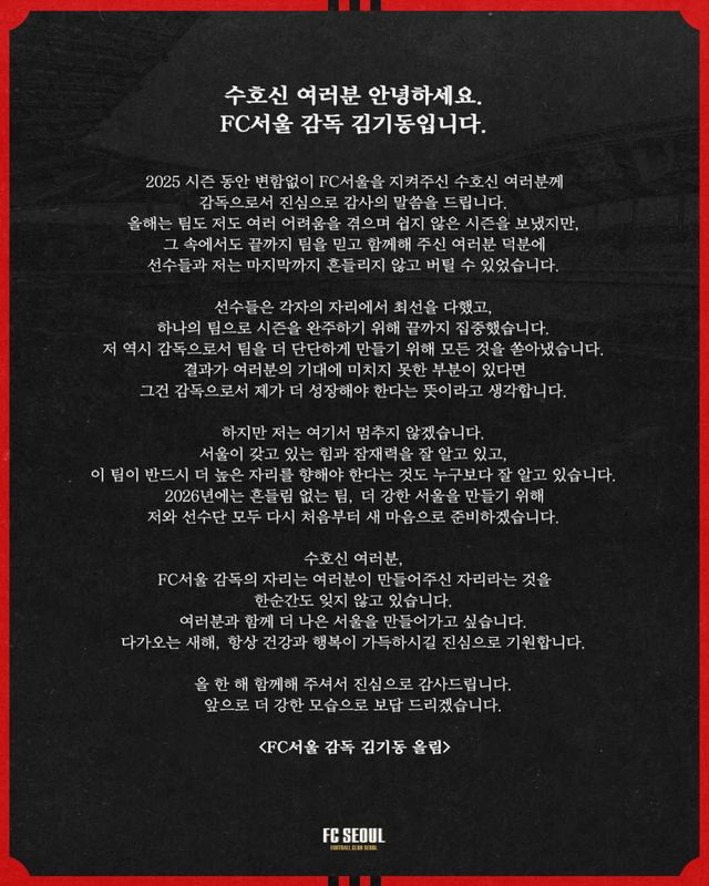 김기동 감독은 11일 오후 서울 구단 소셜미디어(SNS)를 통해 구단 서포터스 수호신을 향한 감시 인사를 전했다. 이날 김 감독은 “2025시즌 동안 변함없이 서울울 지켜준 수호신께 감독으로서 진심으로 감사의 말씀을 드린다”고 운을 떼며 “올해는 팀도 나도 여러 어려움을 겪으며 쉽지 않은 시즌을 보냈다. 그 속에서도 끝까지 팀을 믿고 함께해 준 여러분 덕분에 선수들과 마지막까지 흔들리지 않고 버틸 수 있었다”고 돌아봤다.