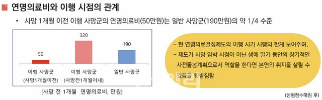 임 연구위원은 “현 연명의료결정제도의 이행 시기 시행의 한계”라며 “제도가 본연의 취지를 살릴 수 있도록 임종기로 규정된 연명의료 중단 시점을 좀 더 앞당기고 환자 본인이 충분한 숙고를 통해 미리 연명의료계획서를 직접 작성해 계획을 세울 수 있도록 해야 한다”고 말했다.