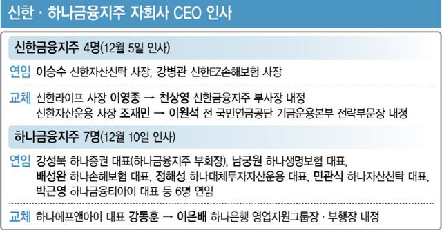 10일 금융권에 따르면 올 연말 임기 만료를 앞둔 4대 금융지주 자회사 CEO는 총 28명이다. 이달 5일 자회사 CEO 인사의 포문을 연 신한금융은 신한라이프와 신한자산운용 등 2곳의 CEO를 각각 천상영 부사장(CFO)과 이원석 전 국민연금공단 기금운용본부 전략부문장으로 교체하기로 했다. 또 이승수 신한자산신탁 사장과 강병관 신한EZ손해보험 사장 등은 연임시켰다.
