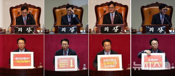 민주당 의원들은 곽 의원을 향해 "피켓 내려라", "창피하지 않느냐"고 고성이 나왔다. 국민의힘 의원들은 "조용해라"고 맞받았다.