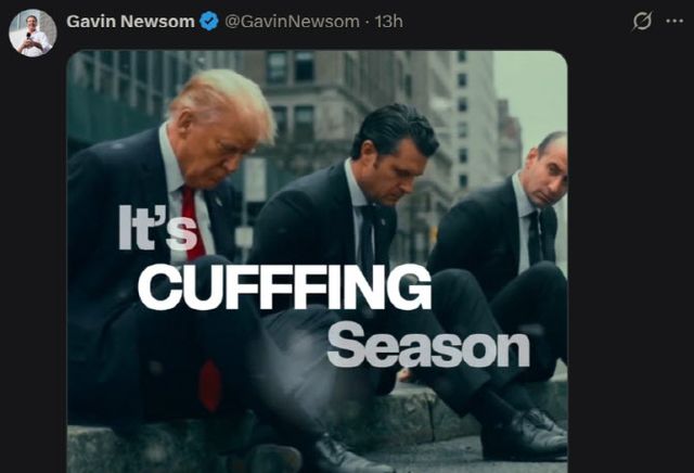 “cuffing season(수갑 채우는 철)”라는 제목이 깔리는 이 영상은 트럼프와 피터 헤그세스 국방장관, 스티브 밀러 국토안보보좌관이 수갑을 찬 채 체포되는 모습을 묘사하고 있다.