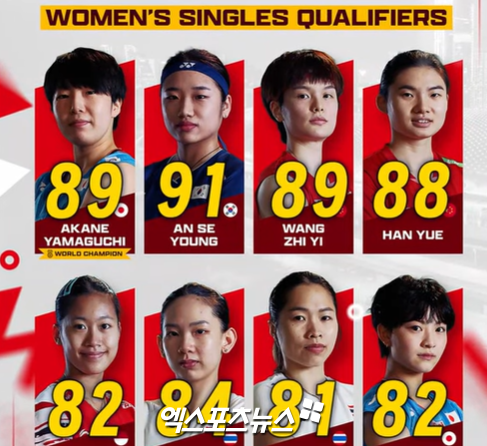 채널에 따르면 안세영이 91점이다. 왕즈이와 지난 8월 프랑스 파리 세계선수권대회에서 금메달을 따낸 야마구치 아카네(일본·세계 3위)가 나란히 89을 얻었다. 야마구치는 지난 9월 코리아오픈에서 안세영을 한 차례 이긴 적이 있다.