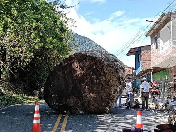 뉴시스 보도에 따르면, 9일(현지시간) 영국 매체 더선에 따르면 지난 8일 오전 10시 콜롬비아에서 도로 위로 굴러 내려온 거대한 바위가 오토바이를 깔아뭉개는 장면이 현지 보안카메라에 담겼다.