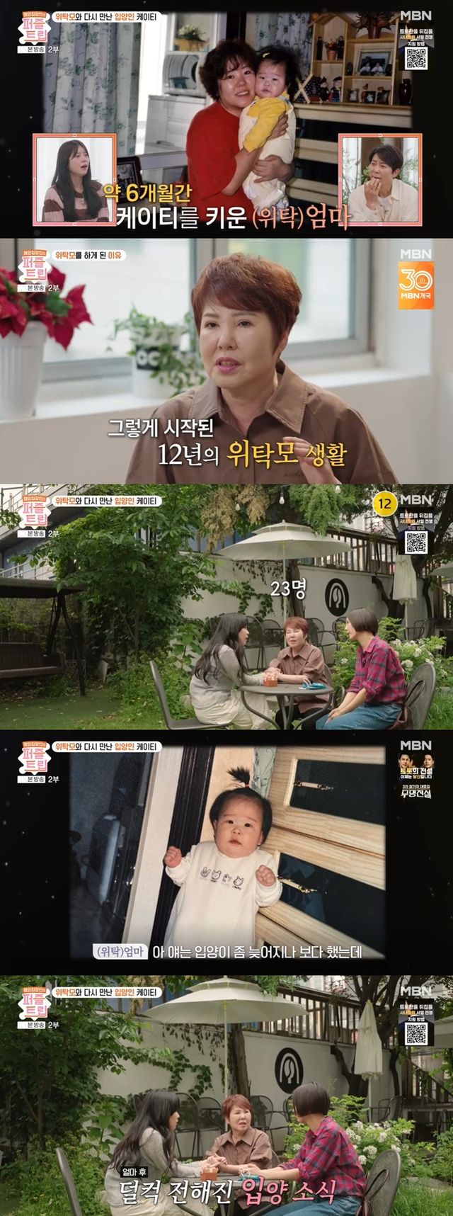 위탁모는 12년 간 위탁모 생활을 해왔다고. 김나영은 "태어나자마자 6개월 까지가 손이 많이 가지 않나"라고 이야기했고, 위탁모는 "얘는 내 옆에서 떨어지지 않았다. 주방에서 뭘 하면 보행기 태워서 날 보고 옹알거린다"며 과거를 생각했다.