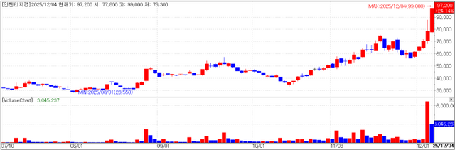 Inventage Lab closed at 97,200 won, up 24.14% (18,900 won) from the previous session. The move is seen as the combined result of the shareholder letter released a day earlier, the removal of the stock from the investment warning issue list, and news that company executives gifted shares to family members.