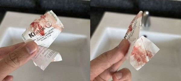 확인해보니 팔에는 피로 보이는 붉은 흔적이 묻어 있었으며, 그는 휴지가 없어 계좌이체 전표로 급하게 닦아냈다고 전했다.