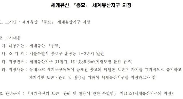 국가유산청은 "세계유산 목록에 등재된 종묘의 탁월한 보편적 가치를 효과적으로 유지하고 체계적인 보존·관리 및 활용을 위해 세계유산지구를 지정하고자 한다"고 설명했다.