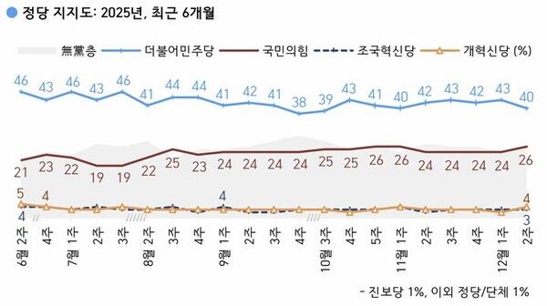 이어 개혁신당 4%, 조국혁신당 3%, 진보당 1% 순이었다. 지지하는 정당이 없는 무당층은 26%로 나타났다.