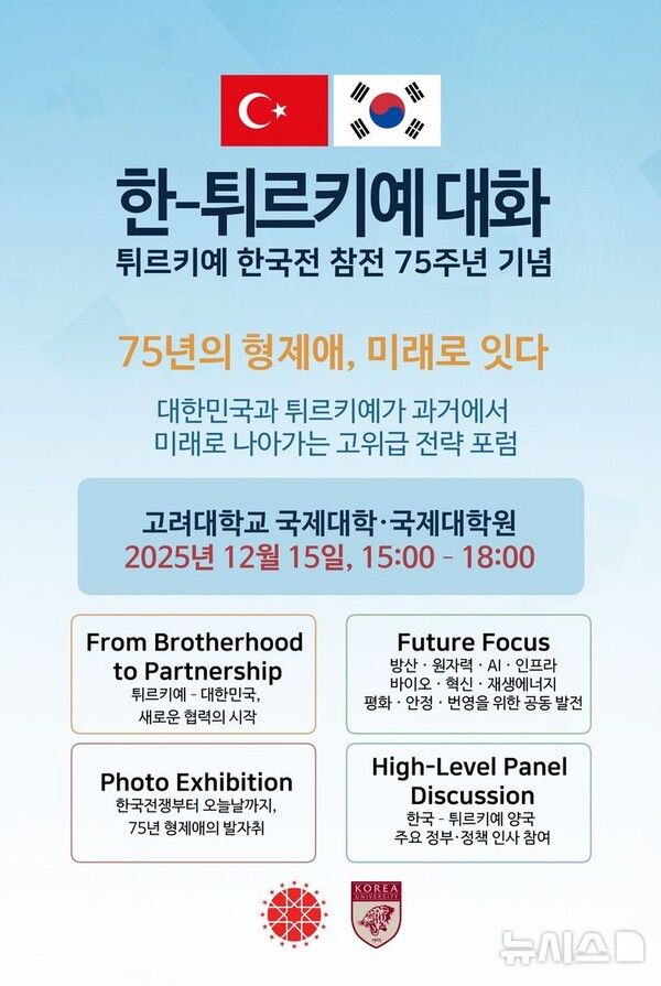 뉴시스 보도에 따르면, 12일 주한 튀르키예 대사관에 따르면 양측은 15일 오후 서울 성북구 고려대 국제관에서 '75년의 형제애, 미래로 잇다'를 주제로 한국전 참전 75주년 기념 고위급 포럼을 연다. 방산, 원자력, 인공지능(AI). 인프라, 바이오, 혁신, 재생에너지, 평화, 안전 등 분야 공동 발전 방안이 논의될 전망이다.