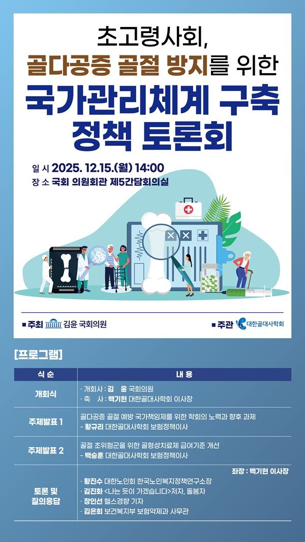 대한골대사학회는 15일 국회 보건복지위원회 소속 김윤 의원(더불어민주당)과 함께 ‘골다공증 골절 방지를 위한 국가관리체계 구축’을 주제로 정책토론회를 개최한다고 밝혔다.