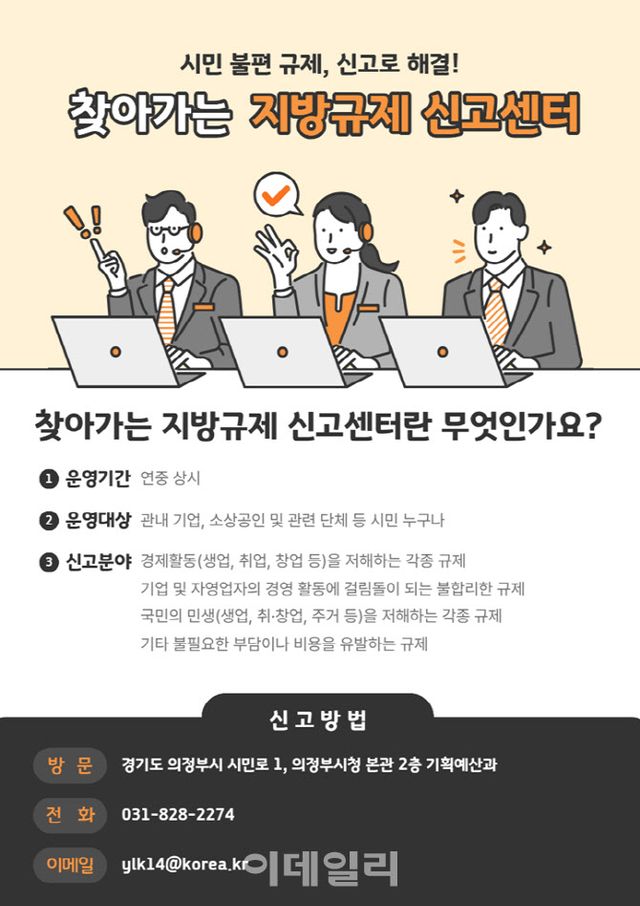 12일 경기 의정부시에 따르면 ‘찾아가는 지방규제 신고센터’는 공무원이 관내 기업, 소상공인 사업장, 관련 단체 등을 직접 방문해 현장의 애로사항을 청취하고 이를 해결하기 위한 규제 개선 방안을 모색하는 제도다.