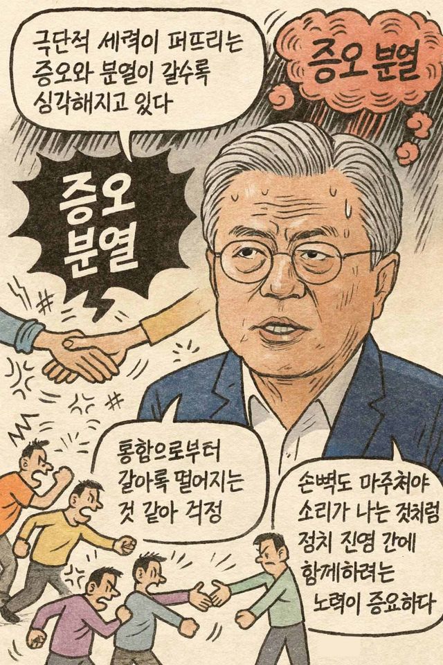 [만평] 문재인 전 대통령의 한 마디. 문 전 대통령은 12일 대통령 직속 국민통합위원회 이석연 위원장을 만나 "극단적 세력이 퍼뜨리는 증오와 분열이 갈수록 심각해지고 있다"고 말했다.