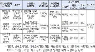식품의약품안전처(처장 오유경)는 수입식품등 수입판매업체인 ‘유한회사 다온(경기도 부천시 소재)’ 등 3개 업체가 수입해 판매한 수입산 ‘백목이버섯’, ‘냉동람부탄’, ‘냉동리치’에서 잔류농약이 기준치 보다 초과 검출되어 해당 제품을 판매 중단하고 회수 조치한다고 밝혔다.