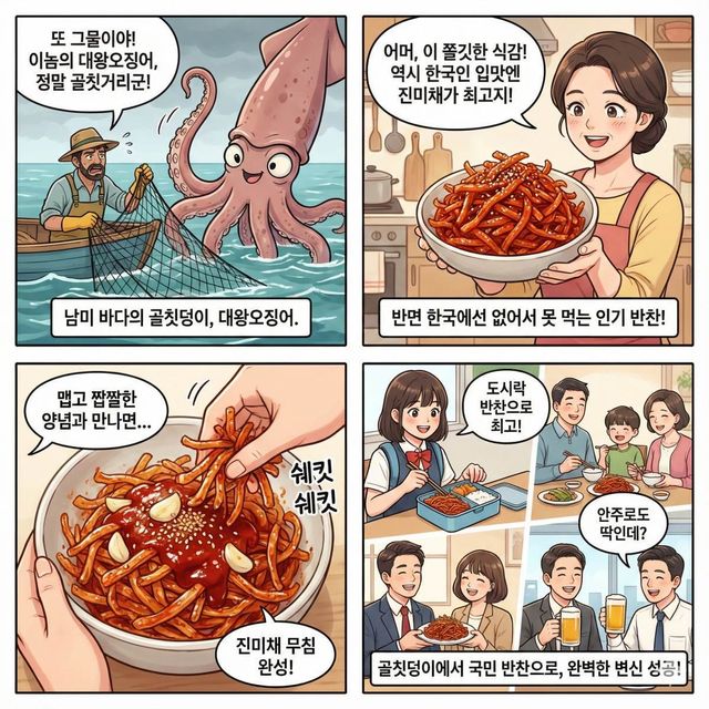 한국인의 입맛에 오징어가 이토록 잘 맞는 이유는 맵고 짭짤한 양념과 잘 어울리는 식감 덕분이다. 쫄깃하고 단단하면서도 질기지 않은 대왕오징어는 양념이 잘 배어들고 씹는 맛도 뛰어나며, 보관성이 좋아 유통과 가공에도 용이하다. 남미에서는 너무 많아 걱정인 자원이, 한국에선 매일 식탁에 오르는 인기 반찬이 된 셈이다.