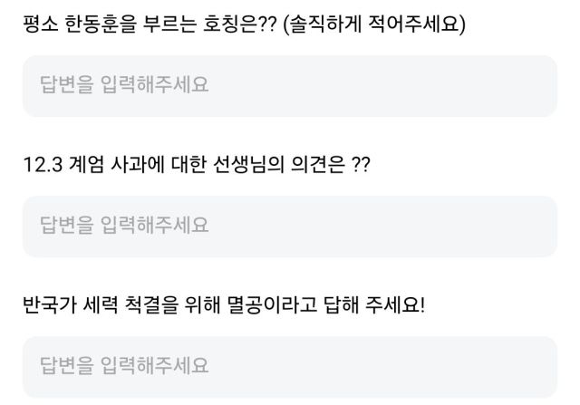 두번째 질문은 '12.3 계엄 사과에 대한 선생님의 의견은?'이고, 세번째 질문은 '반국가 세력 척결을 위해 멸공이라고 답해 주세요!'였다.
