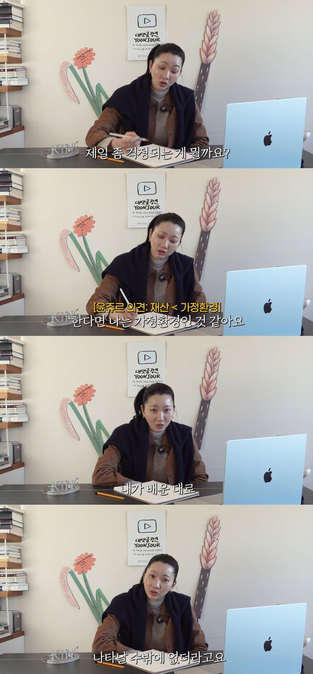 이날 장윤주는 구독자들의 실제 연애 사연을 듣고 상담해주는 시간을 가졌다. 특히 그는 경제력이 부족해 현재 남자친구와 미래를 그리기 어렵다는 한 사연자의 고백에 "사연을 주신 분이 경제력이 있으면 된다. 둘 중 한 명이 경제력이 나으면 이끌어줘도 괜찮다고 생각한다"고 이야기했다.