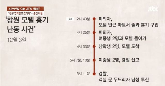 이후 학생들에 화를 내며 술을 마시게 하고 침대에 엎드리게 했다. A씨에게는 마트에서 산 흉기 외에 또 다른 흉기도 갖고 있었으며 자해를 하며 학생들을 위협했다. 그러다 감정이 격해진 A씨는 제보자의 아들을 흉기로 찔렀고 다른 남학생이 여학생을 데리고 도망치려 했지만 객실 내무 중문이 열리지 않아 도망치지 못했다.