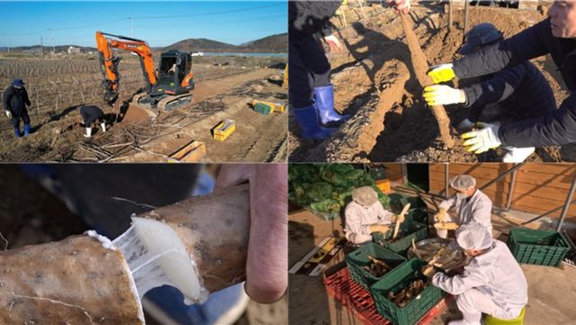 배수가 잘되는 비옥한 땅에서 정성스레 키워내는 장마! 마 중에서 덩이뿌리의 길이가 가장 긴 마를 장마라고 하는데, 길이가 50cm에서 길게는 1m 이상까지 자란다. 점액 단백질인 뮤신이 풍부해 ‘산에서 나는 장어’라 불리는 장마를 얻어내는 과정은 고되다. 땅속 깊이 뿌리내린 장마를 캐기 위해 굴착기 작업은 필수! 굴착기가 땅을 파내는 동시에, 작업자가 땅속에 박힌 마를 하나하나 조심스레 뽑아내야 한다. 특히, 수분이 많고 긴 장마를 온전한 모양으로 캐내기 위해서는 섬세하게 작업을 해야 하는데... 이렇게 정성스레 캐낸 장마는 원물로도 판매하지만 마즙, 마 분말 등 다양한 가공품으로도 생산된다. 특히 분말로 가공하기 위해서는 껍질을 제거하고, 얇게 썰어 건조하는 과정을 거쳐야 하는데... 이 또한 작업자들의 섬세한 손길이 필요한 작업! 가공을 위해 한 자세로 쪼그리고 앉아서 하는 일은 그야말로 고된데... 수확부터 가공까지 이루어지는 그 현장으로 지금 바로 들어가 보자.