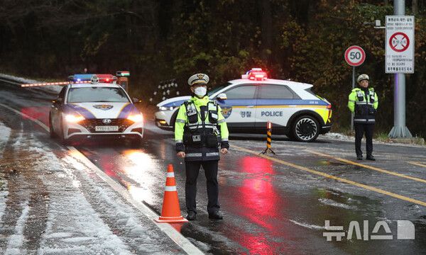 제주도 산지에 대설주의보가 내려진 가운데 제주와 서귀포를 잇는 산간 도로인 1100도로의 차량 운행이 통제됐다.