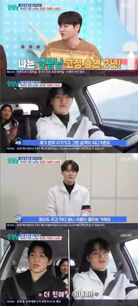 박서진은 "제가 다가가고 그런 성격이 아닌데 승태 형이 먼저 다가와주고 장난도 쳐주고 하니까 농담도 주고받고 마음이 열린 거다"라고 털어놨다.