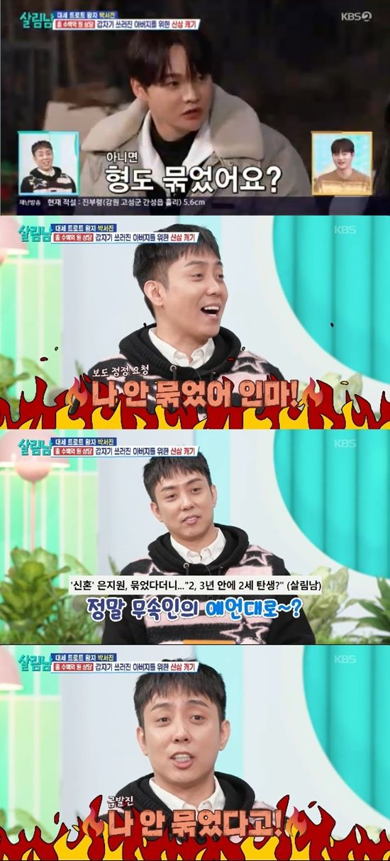 은지원은 박서진이 "그럼 2, 3년 안에 아이가 생긴다는 무속인 말이 맞는 거잖아요"라고 하자 그건 모르는 거라고 말했다.