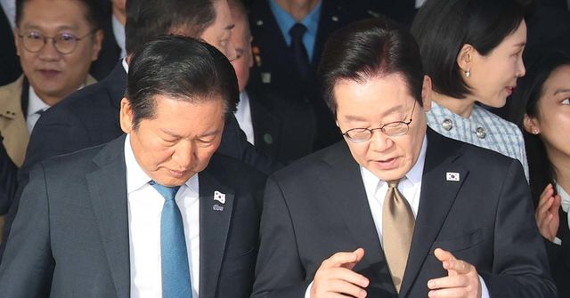 이재명 대통령이 11월 17일 오전 주요 20개국(G20) 정상회의 참석을 계기로 아프리카와 중동 등 4개국 순방을 위해 경기 성남 서울공항에 도착, 정청래 더불어민주당 대표와 대화하며 공군1호기로 이동하고 있다. / 뉴스1