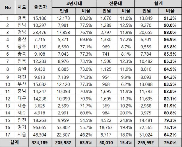 4년제 대학 진학률만을 기준으로 보면 전국 평균은 63.5%인데 경북(80.2%)·전남(77.5%)·충북(77.3%)·부산(77.29%)·광주(77.1%) 등은 평균을 훌쩍 넘었다. 반대로 경기(55.7%)·인천(54.5%)·서울(46.2%)은 전국 평균 대비 진학률이 7.8%포인트 이상 낮았으며, 순위도 최하위권에 그쳤다.
