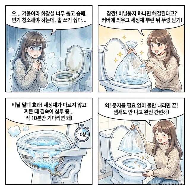 방법은 간단하다. 먼저 한 번 물을 내려 표면을 가볍게 씻어준 뒤, 커버 전체를 비닐로 감싼다. 틈 사이로 세정제를 천천히 넣고 뚜껑을 닫아 밀폐한 상태로 10분 정도 둔다. 이후 비닐을 제거하고 물을 한 번 더 내려 정리하면 끝난다. 문지르는 과정이 줄어 냄새가 퍼지는 시간도 짧아지고, 겨울철 욕실에서 부담이 적다.